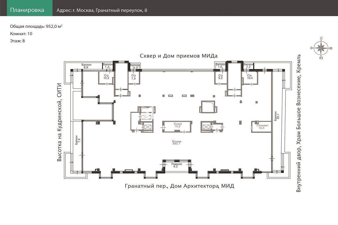 Гранатный, 8 находится в районе Патриарших прудов – одном из самых красивых и уютных районов Москвы с прекрасным окружением, является одним из лучших домов категории deluxe в Москве. Клубный дом на 17 квартир. Собственная развитая инфраструктура: консьерж-сервис, фитнес-центр, сауна, бассейн, ресторан, автомойка в подземном паркинге. Высокий уровень безопасности. Благоустроенная огороженная охраняемая территория. Развитая инфраструктура центра столицы.